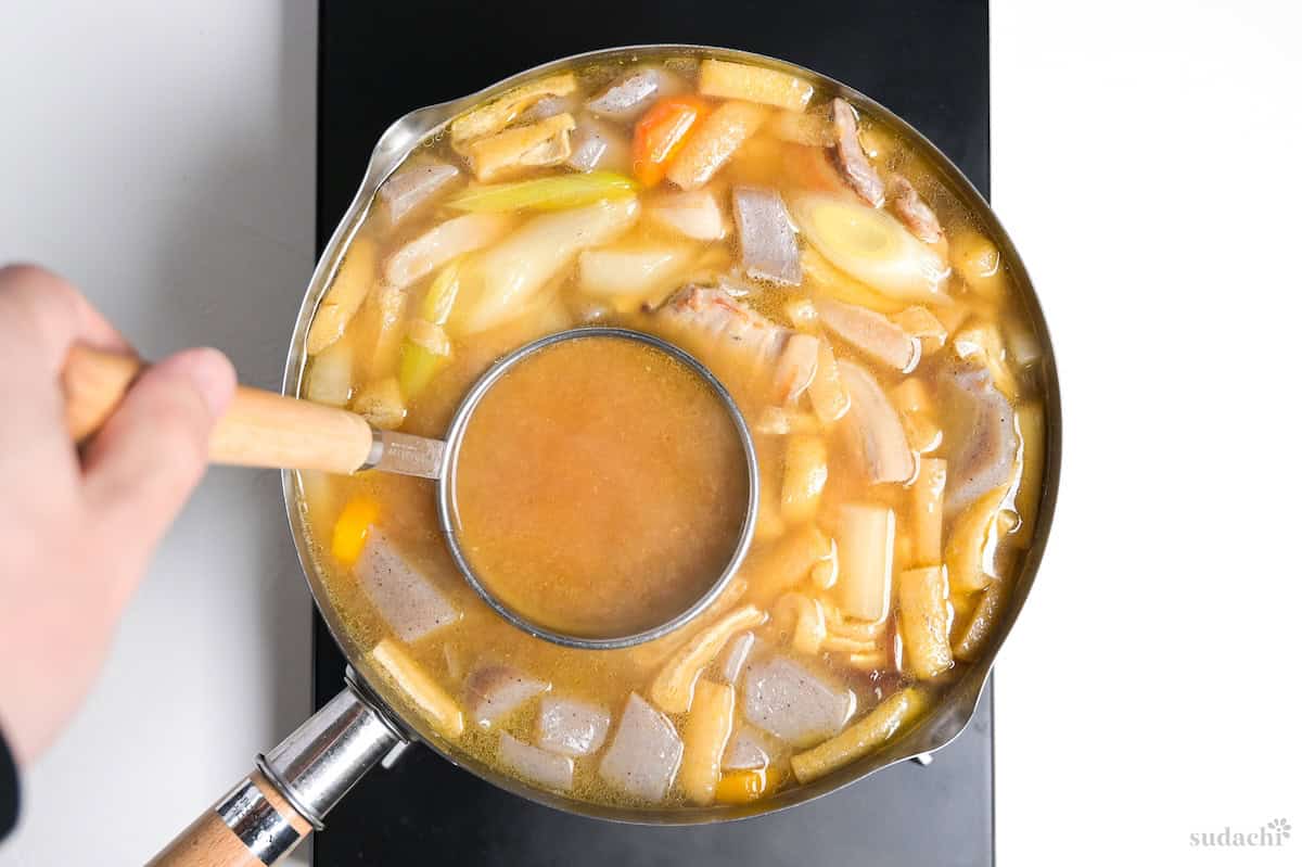 - Turn off the heat and measure out 6-7 tbsp yellow miso paste (awase). Add half of the miso to a miso strainer and whisk until it has dispersed into the soup. Stir gently, taste test, and continue to add the miso using the same method until it tastes good to you.
