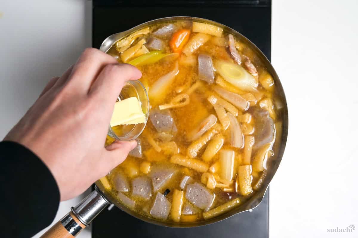 - Pour 1500 ml dashi stock into the pot along with ½ tbsp Japanese soy sauce (koikuchi shoyu) and ½ tbsp mirin, and give it a gentle stir. Bring to a simmer, and let it gently bubble for 10 minutes or under the daikon is softened with a little bite.